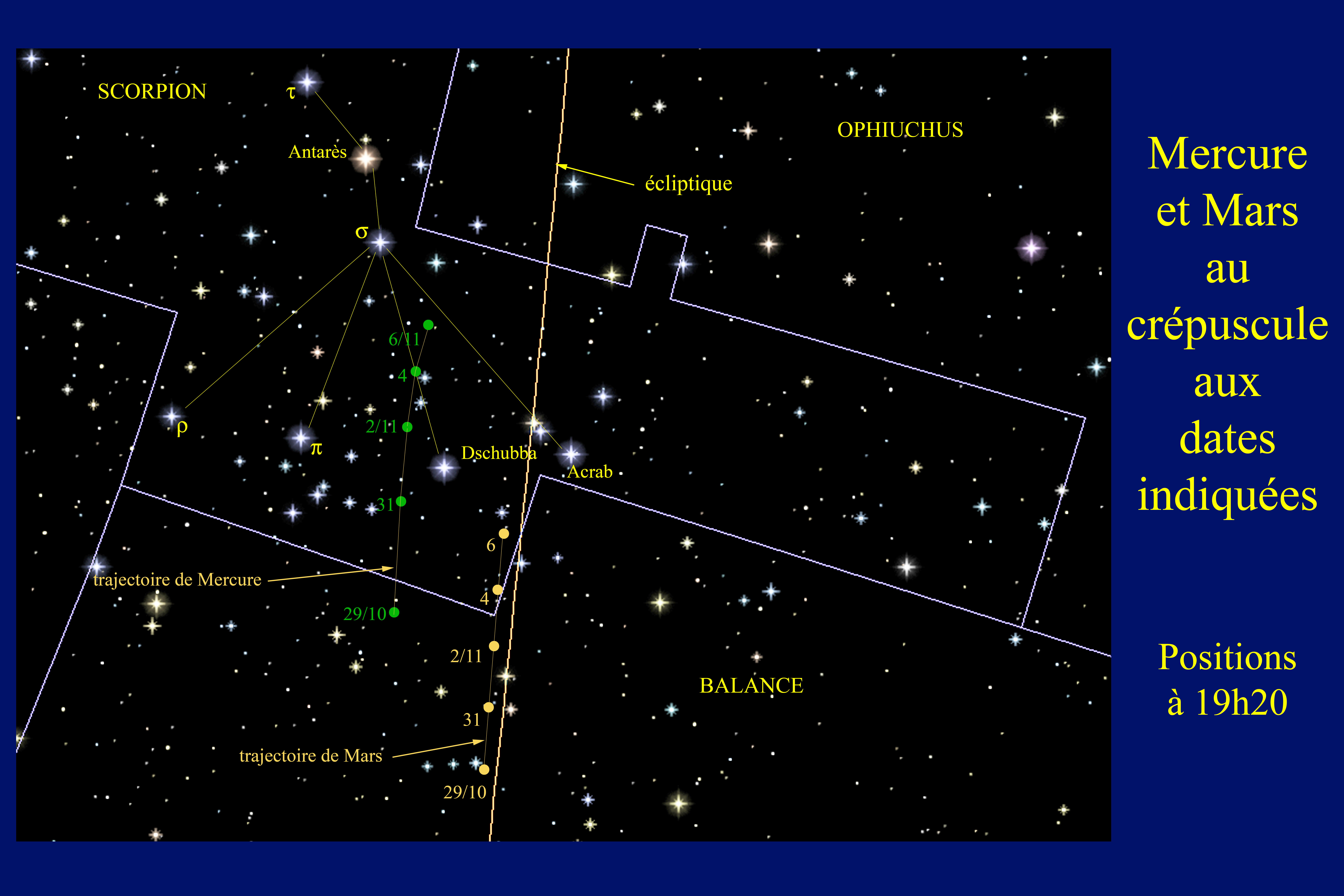 Samedi 1er à 19h10 : Mercure est à 14° de hauteur sur l’horizon WSW, devant les pattes du Scorpion. Dschubba (= delta Scorpion) est 0,9° à droite de Mercure. Acrab (= bêta Scorpion) est 4° à droite de Mercure. Antarès (= alpha Scorpion) est 7° au-dessus et un peu à gauche de Mercure. Mars est 5,5° en dessous et un peu à droite de Mercure. Déplacements à suivre jusqu’au 12 ; le Soleil est alors à h=-8,5°.